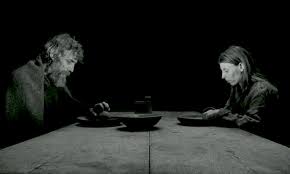 But there is a subtle directional movement of intensification of mood that takes place as the movie continues. We get hints of this movement throughout. A friend comes by to get some palinka (vodka?) one night. This is the only scene where speech goes beyond the father’s curt commands or grunts when they bump into things in the night. The friend offers a monologue of Nietzchean thought to the father, even waxing poetic in his grim passion: